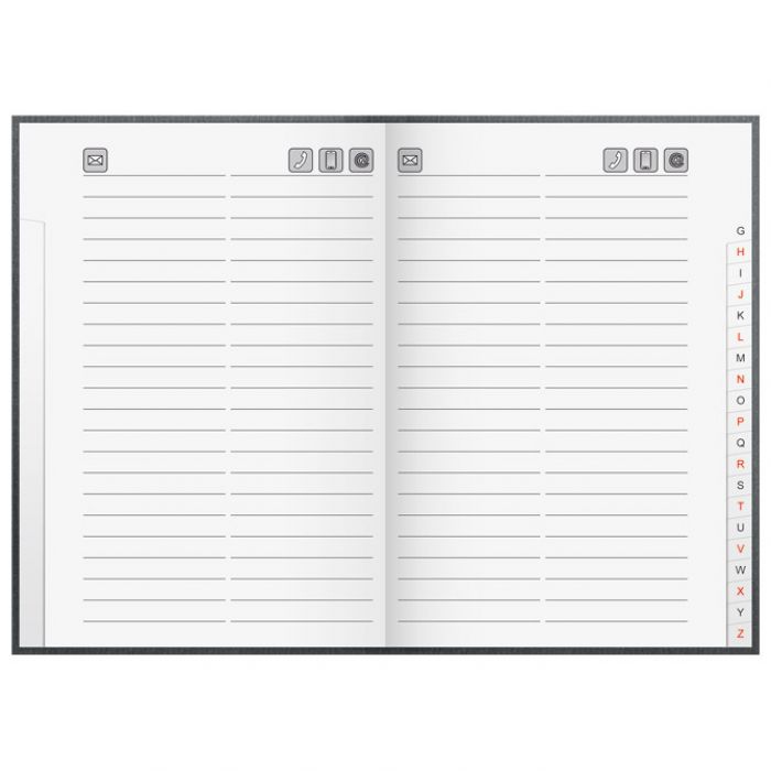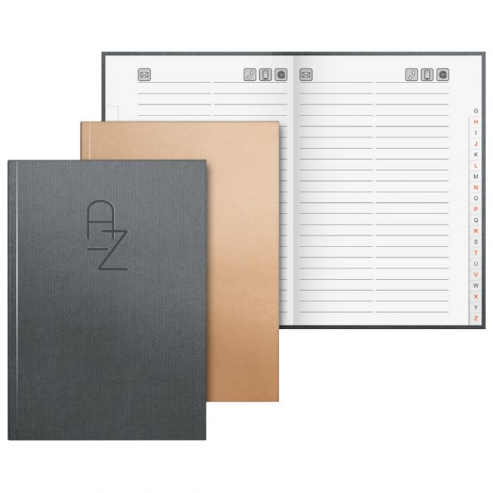 format: A5; dimenzija: 145×205 mm; 128 stranica; plastificiran indeks (A-Z); 2 boje: antracit i zlatna