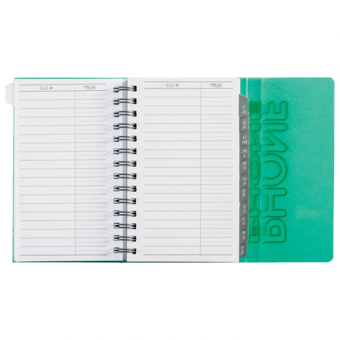 dimenzija: 85×125 mm; 144 stranice; plastificiran indeks (A-Z); PP; s gumicom (u boji adresara) i spiralom; 5 boja: crvena, narančasta, plava, zelena i žuta