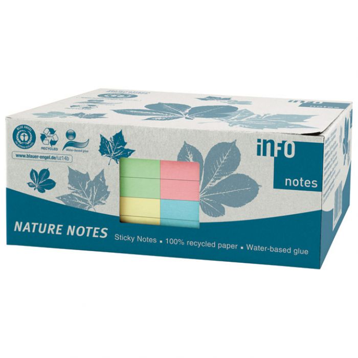 dimenzija: 125×75 mm; 12×100 listova; mogućnost višestrukog premještanja; izrađen od 100 % recikliranog papira; ekološki prihvatljiv (Blue Angel certifikat); ljepilo je bez otapala izrađeno na bazi vode; 4 pastelne boje: roza, plava, zelena i žuta; u 100 % recikliranoj kartonskoj kutiji