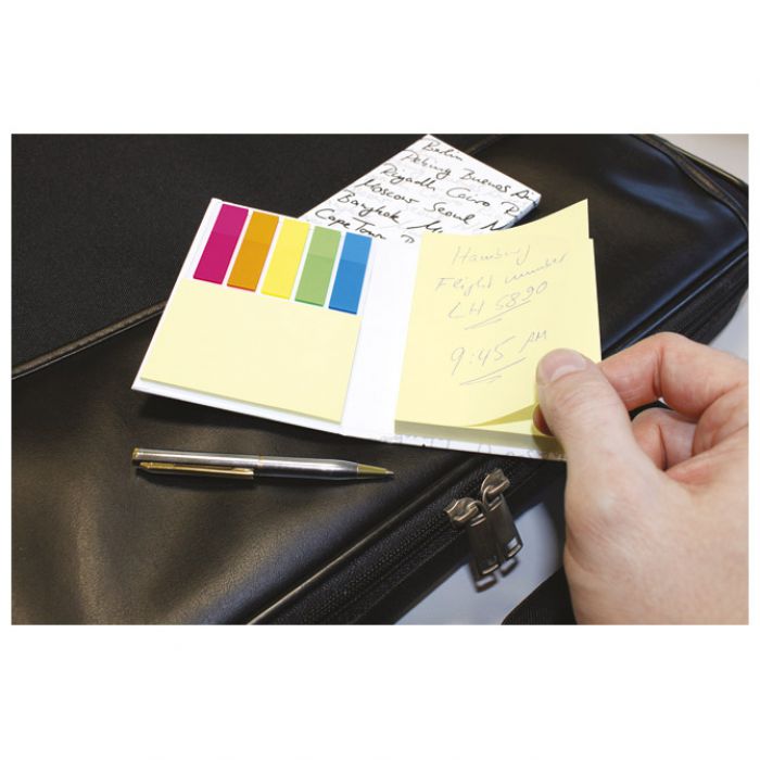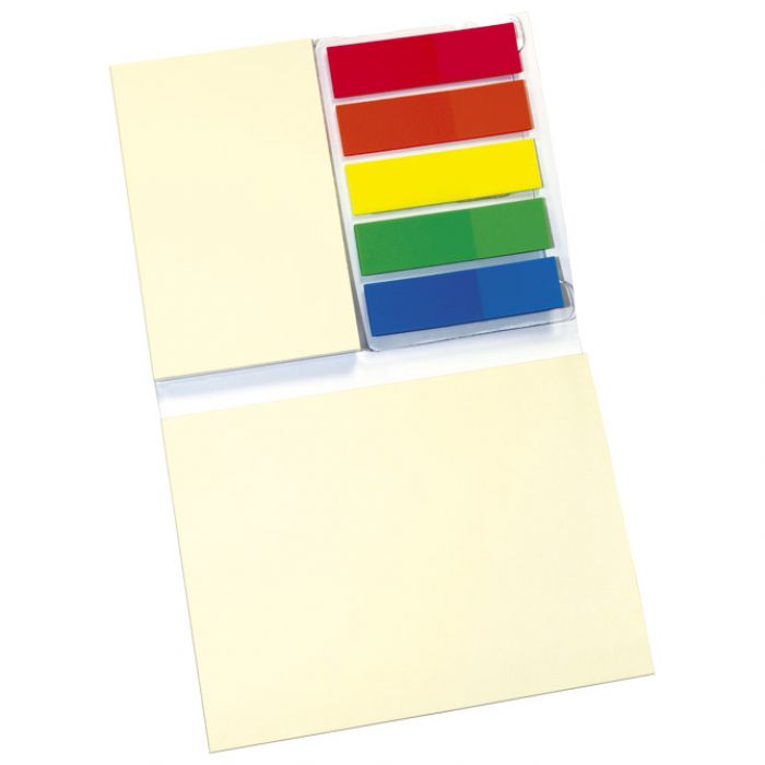 2 bloka samoljepljiva žuta (dimenzija: 75×100 mm, 50 listova + dimenzija: 48×75 mm, 25 listova) i zastavice (dimenzija: 12×44 mm, 20 listova, 5 boja: narančasta, pink, plava, zelena i žuta); u korici; blister