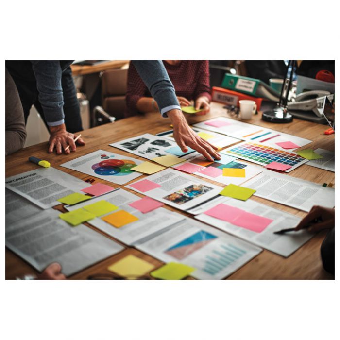 dimenzija: 75×75 mm; 100 listova; mogućnost višestrukog premještanja; ljepilo je bez otapala izrađeno na bazi vode; 4 neon boje: ljubičasta, narančasta, zelena (2x) i žuta (2x)