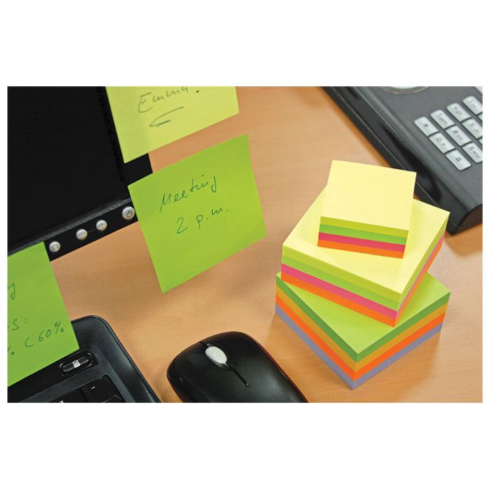 dimenzija: 50×50 mm; 240 listova; mogućnost višestrukog premještanja; ljepilo je bez otapala izrađeno na bazi vode; 4 neon boje: narančasta, roza, zelena i žuta