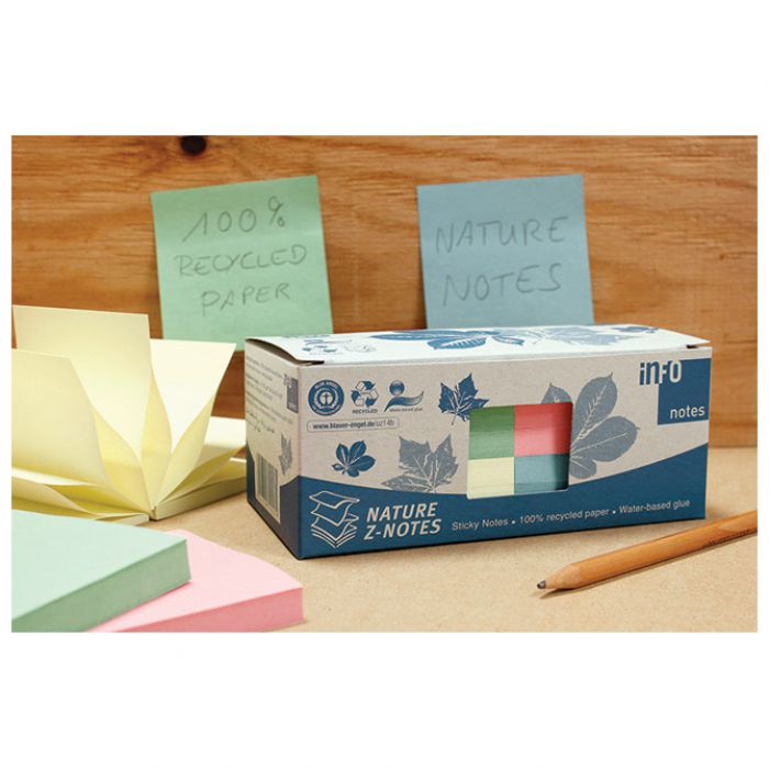 dimenzija: 75×75 mm; 12×100 listova; mogućnost višestrukog premještanja; izrađen od 100 % recikliranog papira; ekološki prihvatljiv (Blue Angel certifikat); ljepilo je bez otapala izrađeno na bazi vode; 4 pastelne boje: roza, plava, zelena i žuta; u 100 % recikliranoj kartonskoj kutiji; za stalak: 5643-01 i 5647-00