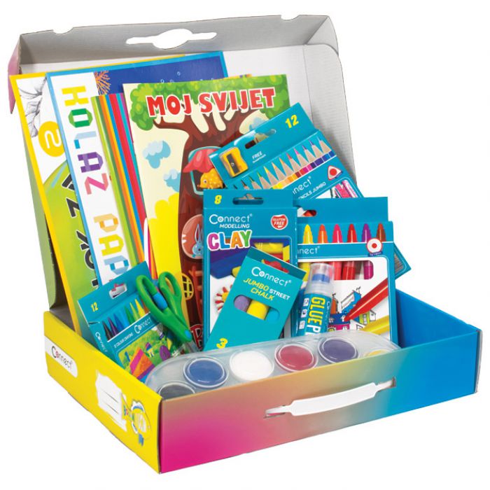set sadrži: boje drvene Jumbo, flomastere Jumbo, boje voštane Jumbo, boje vodene, kreda Jumbo, plastelin, 2xbojanke, kolaž, blok risaći, škare, ljepilo; u kartonskoj kutiji s ručkicom