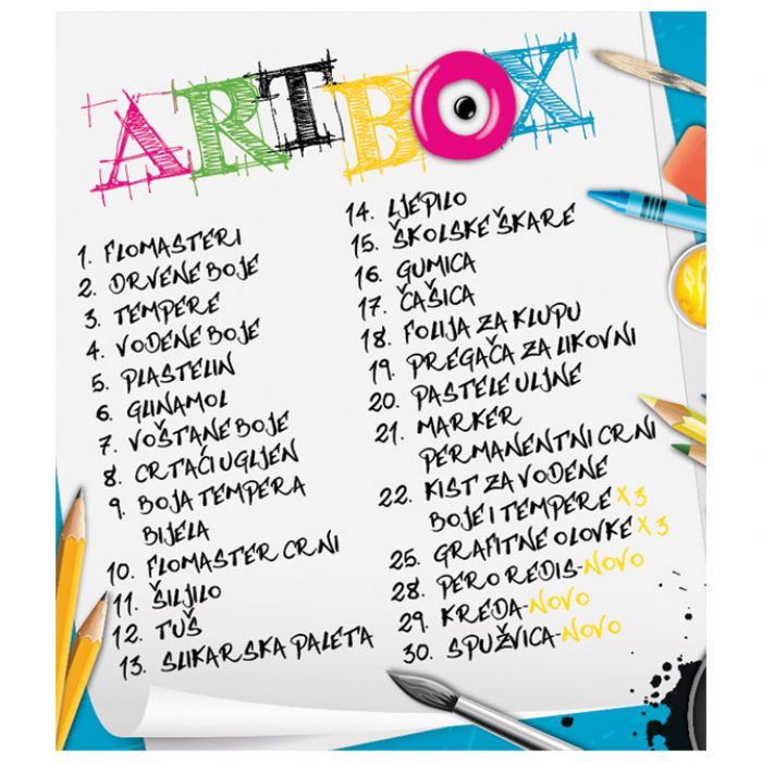 set sadrži: grafitne olovke, drvene boje, flomastere, voštane boje, vodene boje, tempere, paletu, kistove, glinamol, plastelin, ugljen, crni tuš, pero redis i držalo, spužvica, kreda ulična, škarice, ljepila, gumicu, čašicu, foliju za klupu, boju temperu bijelu, flomaster školski crni, pregaču za likovni, šiljilo, marker permanentni i pastele uljne; u kartonskoj kutiji