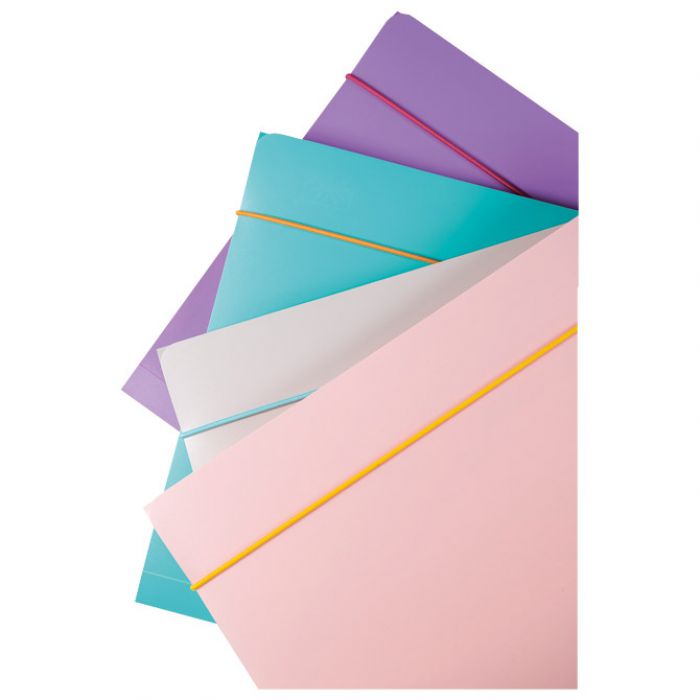 format: A4; debljina 0,6 mm PP; set od 4 komada; 3 klape i gumica omogućuju sigurnost dokumenata i elastično zatvaranje; paket također uključuje 4 dodatne elastične gumice za prilagođavanje korisniku; neuništiv; 100 % reciklirajući; otporan na vlagu; dvobojan (iznutra/izvana): ljubičasta/fuksija, svijetloplava/pijesak, akvamarin/narančasta i ružičasto/žuta
