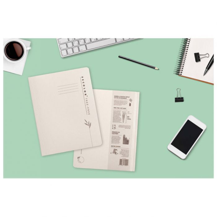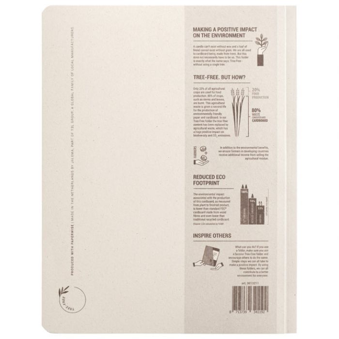 format: A4; dimenzija: 250×310 mm; karton; mehanika: 8 cm; prednja strana je s otisnutim linijama za lakše i preglednije označavanje sadržaja; izrađen od poljoprivrednog otpada odnosno od listova i stabljika koji bi se inače spaljivali na otvorenom; za izradu ovog artikla se ne koristi niti jedno stablo!