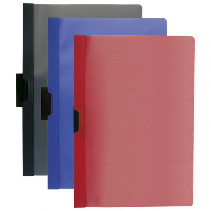 format: A4; PP; drži do 30 listova 80 gramskog papira; prednji dio je proziran, zadnji u boji; metalni klip na sredini