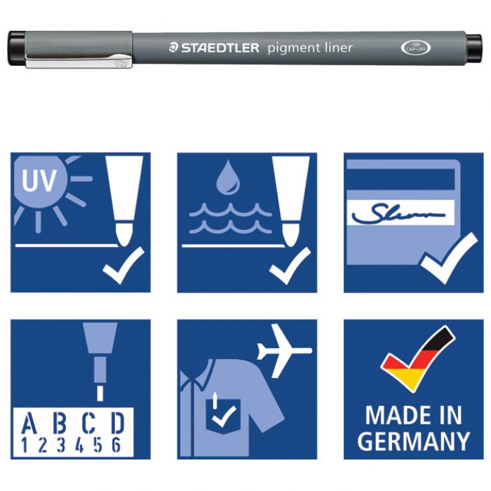 okrugli vrh sa metalnim ojačanjem; spremnik PP; permanentni (sukladno ISO 14145-2), pigmentni; vodootporan; može se brisati u slučaju upotrebe na papiru za precrtavanje; otporan na UV svjetlost; može biti nezatvoren 12 sati bez isušivanja (CAP OFF); idealan za crtanje, skiciranje i pisanje; siguran rad u zrakoplovu zahvaljujući sustavu za izjednačavanje tlakova koji sprječava istjecanje tinte (airplane safe)