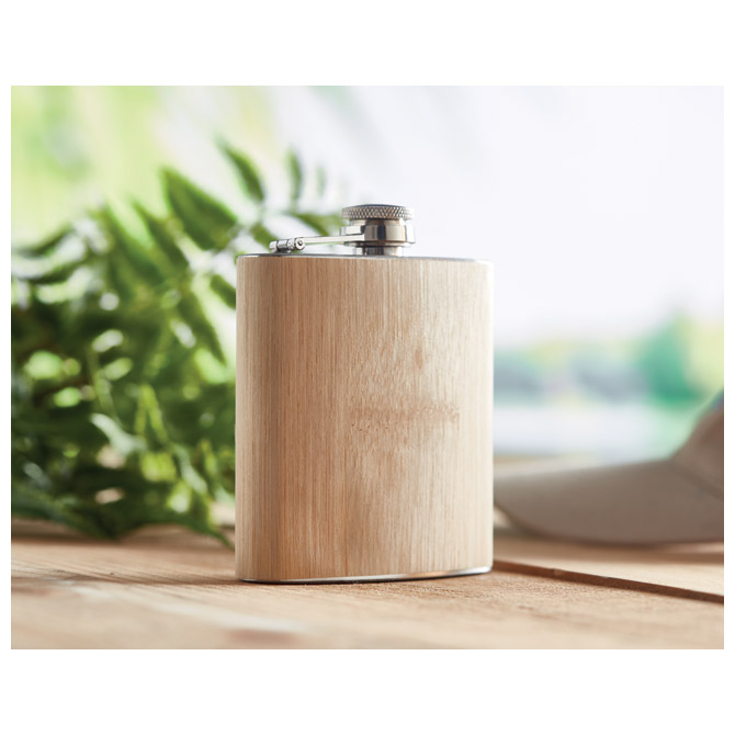 175 ml; metalna; s elegantnom završnom obradom od bambusa; sigurnosni čep; dimenzija: 11x9x2 cm