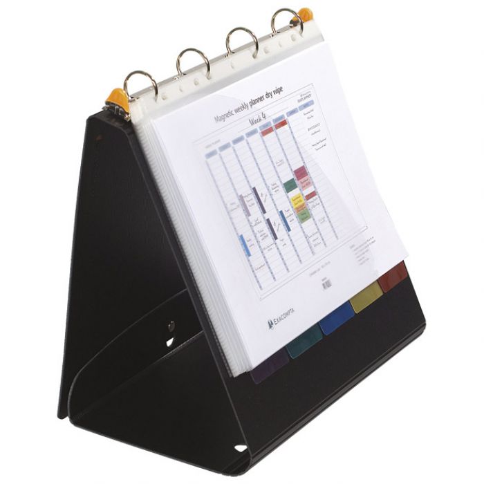 format: A4; dimenzija: 295×320 mm; reciklirani PP; 4 ringa; ring fi: 30 mm; sadrži: džep za vizitku i CD, 5 pregrada, 25 uložnih fascikli; može se složiti kao stolni stalak; zatvaranje na gumb