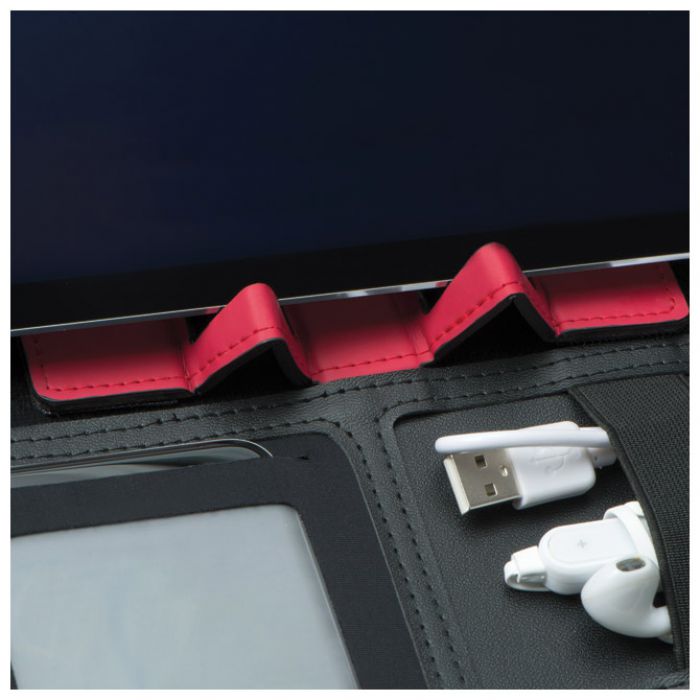 format: A4; dimenzija: 365x270x60 mm; sadrži: džepiće za kartice, pretince za mobitel, tablet i kalkulator, mjesto za olovku i kabele i blok za bilješke; 4 ringa; zatvaranje na zip; sa ručkom za nošenje