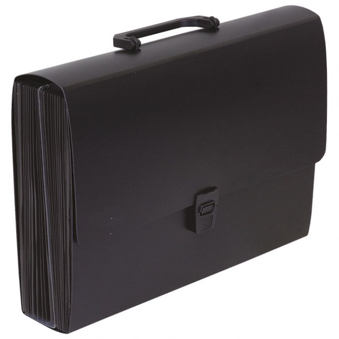 format: A4; dimenzija: 330x240x75 mm; PP; ima 26 prozirnih PP pregrada; s ručkom i kopčom za zatvaranje