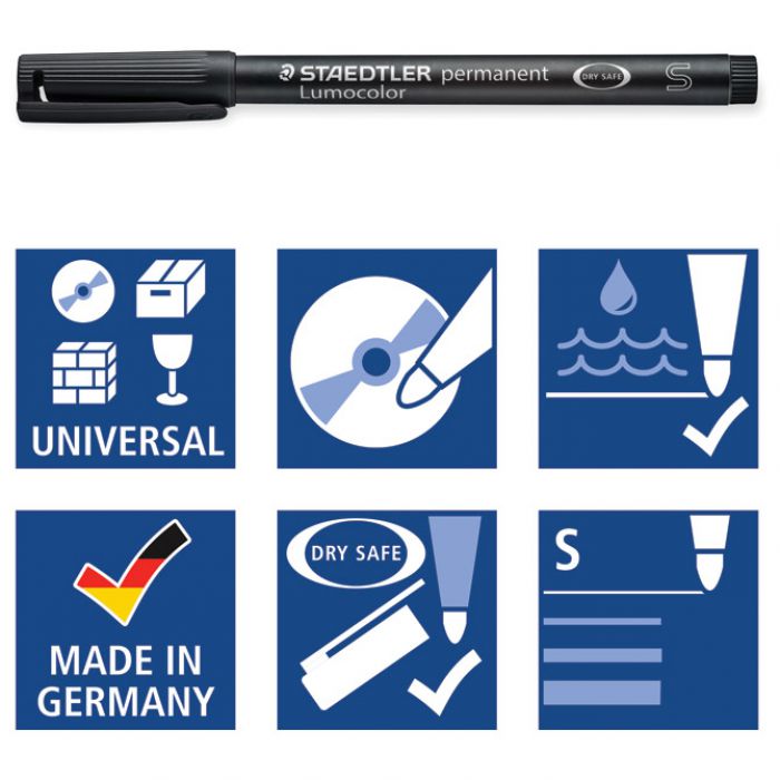 širina ispisa 0,4 mm; spremnik i poklopac PP; vodootporan; otporan na UV svjetlost; brzo se suši (pa je pogodan za ljevake); ne razmazuje se; slabog mirisa; primjenjuje se na gotovo svim površinama (papir, karton, folija, plastika, staklo, porculan, drvo, koža, kamen, CD,..); može biti nezatvoren danima bez isušivanja (dry safe); siguran rad u zrakoplovu zahvaljujući sustavu za izjednačavanje tlakova koji sprječava istjecanje tinte (airplane safe); ekološka tinta (bez ksilena i toulena); tijelo je izrađeno od 97 % reciklirane plastike