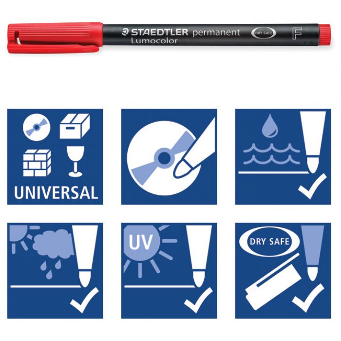 širina ispisa 0,6 mm; spremnik i poklopac PP; vodootporan; otporan na UV svjetlost; brzo se suši (pa je pogodan za ljevake); ne razmazuje se; slabog mirisa; primjenjuje se na gotovo svim površinama (papir, karton, folija, plastika, staklo, porculan, drvo, koža, kamen, CD,..); može biti nezatvoren danima bez isušivanja (dry safe); siguran rad u zrakoplovu zahvaljujući sustavu za izjednačavanje tlakova koji sprječava istjecanje tinte (airplane safe); ekološka tinta (bez ksilena i toulena); tijelo je izrađeno od 97 % reciklirane plastike