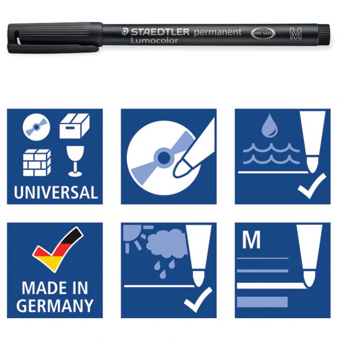 okrugli vrh; širina ispisa 1 mm; spremnik i poklopac PP; vodootporan; otporan na UV svjetlost; brzo se suši (pa je pogodan za ljevake); ne razmazuje se; slabog mirisa; primjenjuje se na gotovo svim površinama (papir, karton, folija, plastika, staklo, porculan, drvo, koža, kamen, CD,..); može biti nezatvoren danima bez isušivanja (dry safe); siguran rad u zrakoplovu zahvaljujući sustavu za izjednačavanje tlakova koji sprječava istjecanje tinte (airplane safe); ekološka tinta (bez ksilena i toulena); tijelo je izrađeno od 97 % reciklirane plastike