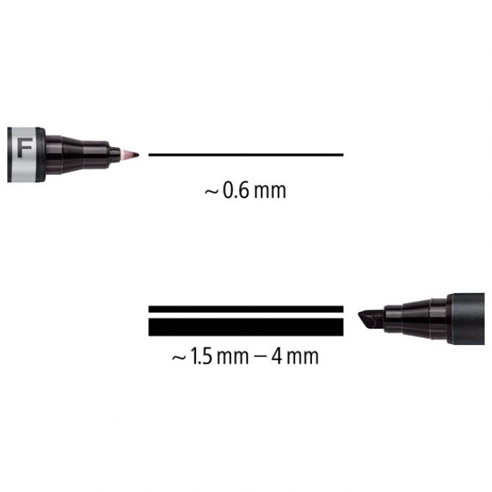 marker s dva vrha različitih debljina; širina ispisa: 0,6 mm (F) i 1,5 mm (M); spremnik i poklopac PP; međusobno zamijenjivi poklopci; vodootporan; otporan na UV svjetlost; brzo se suši (pa je pogodan za ljevake); ne razmazuje se; slabog mirisa; primjenjuje se na gotovo svim površinama; može biti nezatvoren danima bez isušivanja (dry safe); siguran rad u zrakoplovu zahvaljujući sustavu za izjednačavanje tlakova koji sprječava istjecanje tinte (airplane safe); ekološka tinta (bez ksilena i toulena)