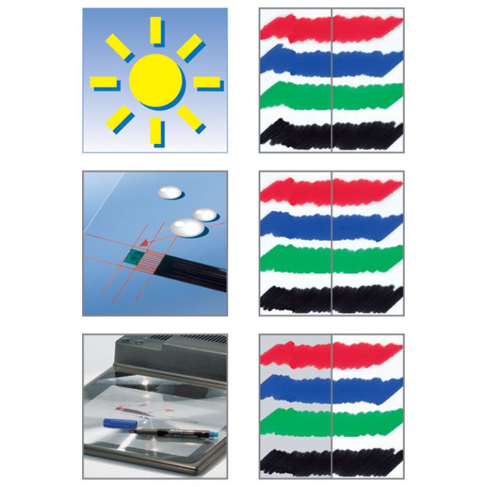 širina ispisa: 0,4 mm (S – Super fine); vodootporan; jako otporan na svjetlo; tinta izvrsno prianja i suši se trenutačno; trajna tinta za gotovo sve glatke površine: staklo, folije, CD-e, DVD-e, plastiku, kamen, drvo, metal; može se brisati s ugrađenom posebnom gumicom; intenzivne boje i jasne linije