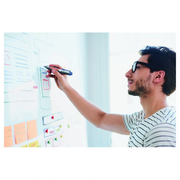 nepermanentni; s mogućnošću ponovnog punjenja; okrugli vrh; širina ispisa 1,5-3 mm; bez kapice; sistem izvlačenja i uvlačenja koji čuva od isušivanja markera; lako se briše sa svih glatkih površina (staklo, melamin,…); za pisanje po svim glatkim površinama i bijeloj ploči