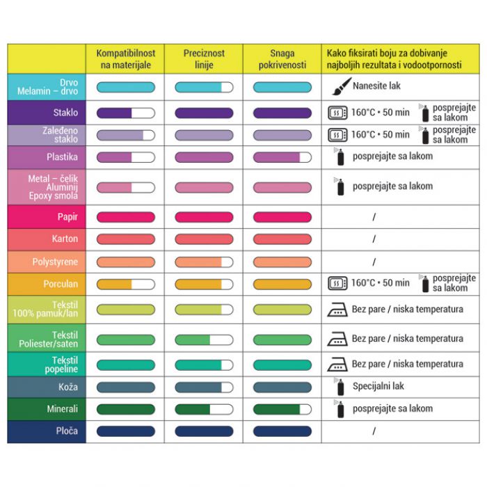 pigmentna tinta na vodenoj bazi; za pisanje i dekoriranje na svjetlom i tamnom papiru i primjena na gotovo svim površinama (plastika, metal, tkanina, staklo…); idealno za kreativne aktivnosti; brzo se suši; visoka otpornost i neprozirnost tinte; velika otpornost vrha; aktiviranje vrha na markeru: protresite 20-ak puta prije upotrebe bez skidanja kapice..aktivirajte vrh tako da ga pritisnete na komad papira dok ne krene puštati tintu; po završetku vratite kapicu a vrh markera okrenite prema gore kad nije u uporabi
