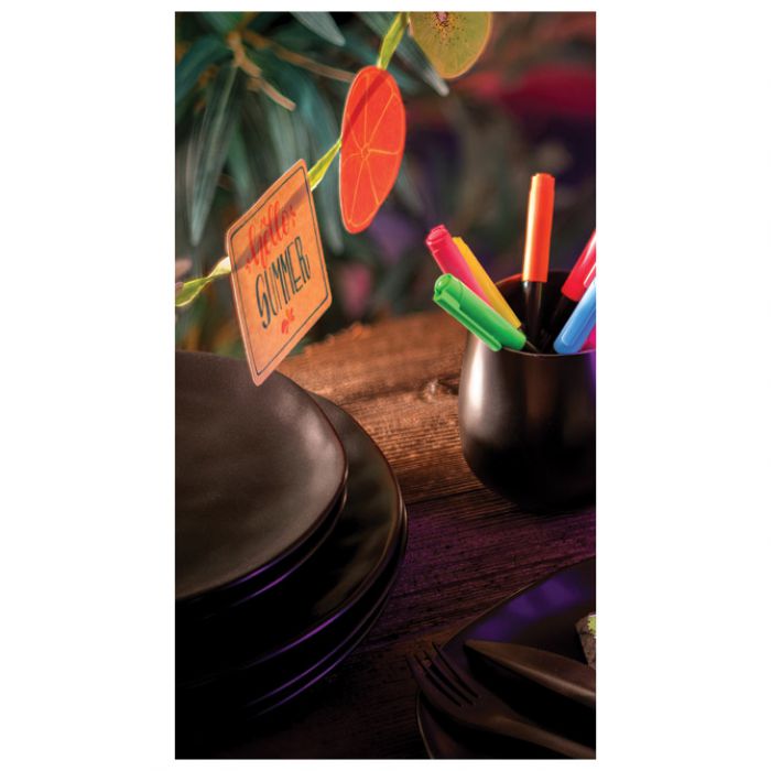 permanentni; okrugli vrh (1,5 mm); širina ispisa 1-2 mm; za: papir, karton, staklo, plastiku, metal, kamen…; nakon 30 minuta u pećnici na 160°C tinta postaje vodootporna (ne prati u perilici posuđa); tinta na bazi vode; tinta ne prolazi kroz papir; bez mirisa; nije potrebno pumpanje ili mućkanje markera; neon efekt; otporan na mrlje; marker čuvati u vodoravnom položaju kad nije u uporabi