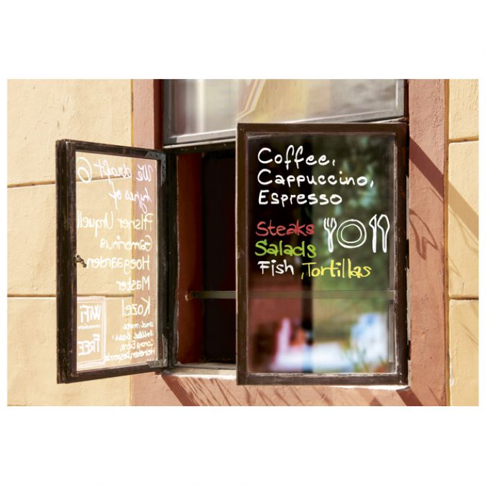 nepermanentni; okrugli vrh; širina ispisa 2-3 mm; tekuća kreda na bazi vode; otporan na svjetlo; za pisanje po glatkim površinama (staklo, prozor, tamna ploča…); briše se vlažnom krpom