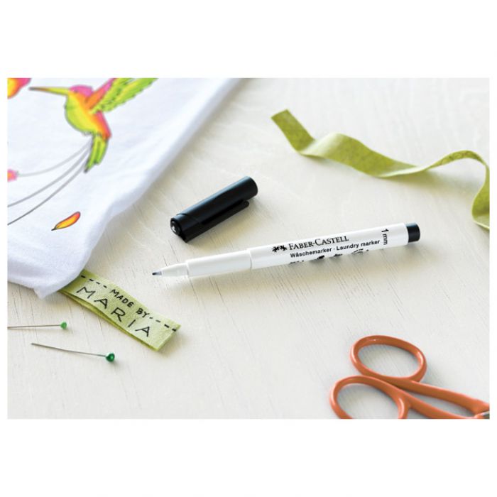 permanentni marker za mnoge tkanine; okrugli vrh; širina ispisa 1 mm; tijelo markera i poklopac su izrađeni od 100 % reciklirane plastike; idealno za označavanje bitnih podataka na tekstilu (ime, odjel i dr.); fiksira se samostalno nakon 24 sata ili odmah ako se glača vrućom peglom bez pare; nakon fiksiranja otporan na pranje do 95°C ovisno o vrsti tkanine i sadržaju prirodnih vlakana