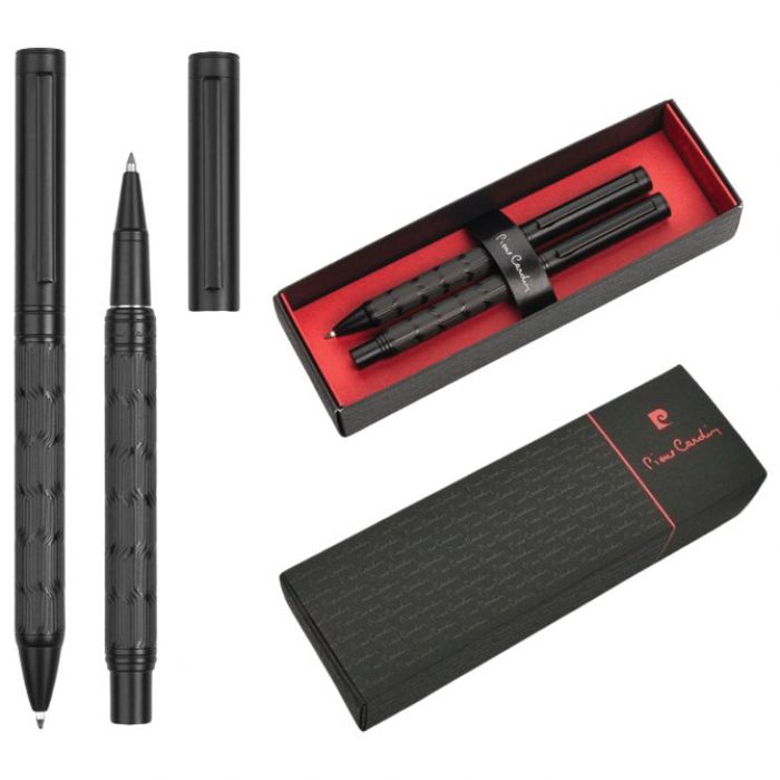Elegantni Pierre Cardin set metalnog pribora za pisanje. Tijela olovki dizajnirana su u crnoj boji s maštovitim strukturiranim dizajnom. Vrh rolera zaštićen je poklopcem u boji olovke, kemijska olovka ima rotirajući mehanizam. Roler sadrži njemački Schmidt uložak u plavoj boji s vrhom od 0,6 mm, kemijska olovka sadrži kvalitetno punjenje u plavoj boji s vrhom od 1 mm. Obje dolaze s rezervnim crnim punjenjem u poklon kutiji s certifikatom autentičnosti.