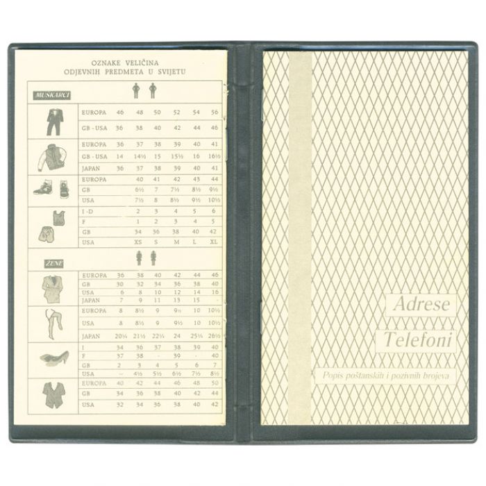 dimenzija: 90×160 mm; boje: plava i metalik siva; korica je izrađena od materijala koji je pogodan za: sitotisak