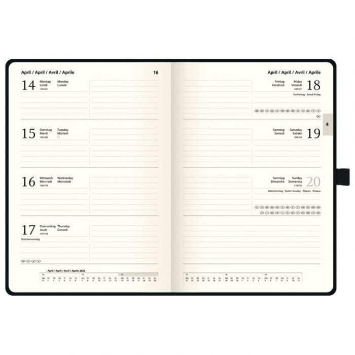 format: A5; 144 stranice; papir šamoa 80 g/m2; dvije strane jedan tjedan; mjesto za olovku; džep s adresarom na zadnjoj korici; savitljiva korica s gumicom; tekst na: njemači, engleski, francuski i talijanski