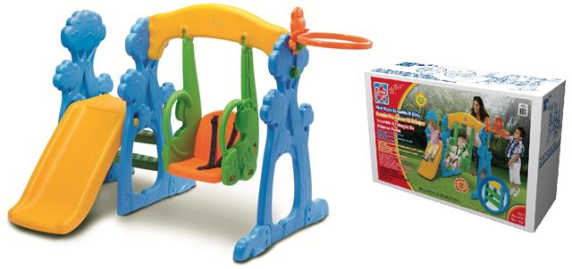 Aktivni centar First Steps za djecu od 1,5 do 4 godine. Centar uključuje tobogan dužine 75 cm. Široke stepenice za lako penjanje i ljuljačka s pojasom koji se pričvršćuje u 3 točke. Uključen koš za košarku. Jednostavno za slaganje, živih boja. Težina 13 kg. Dimenzije DxVxŠ=122x98x115 cm, dimenzije pakiranja DxVxŠ=93x52x34 cm.