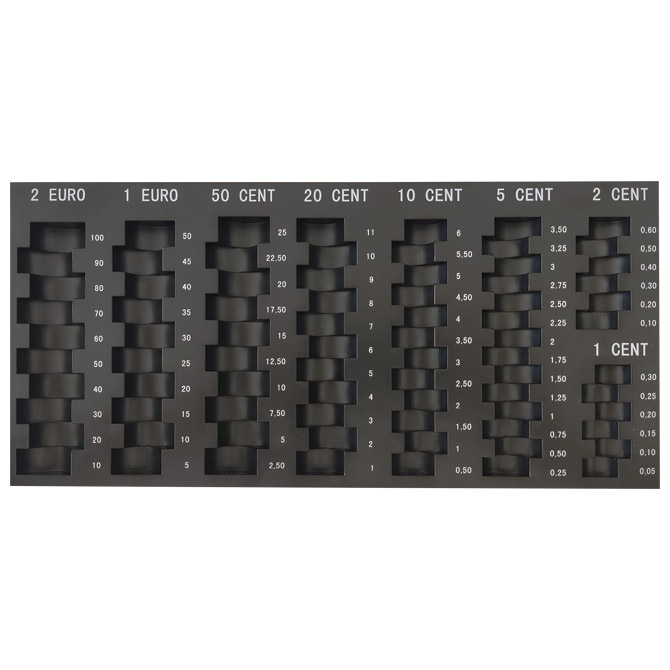 izrađen od plastike; kompaktni podložak za kovanice valute EUR omogućuje jednostavno sortiranje kovanica na svim prodajnim mjestima i