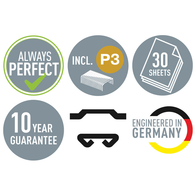 stolni; spaja do 3 mm debljine ili 30 listova papira 80 g/m2; spajanje: otvoreno i zatvoreno klinasto; spajalice: 100 kom x br.24/6 ili 140 kom x br.26/6; garancija 10 godine