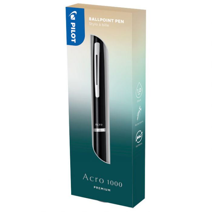 promjer kuglice: 1,00 mm, širina ispisa: 0,28 mm; metalna; metalna klipsa; elegantan i tanki dizajn tijela s metalnim prstenom; otporna kuglica od volfram-karbidne legure; nova generacija tinte na bazi ulja, vodootporna i brzo se suši; omogućuje neuobičajeno glatko pisanje bez prekidanja crte; pritisni mehanizam; uložak BRFV-10; u poklon kutiji. Prva premium kemijska olovka Acroball savršena za ured ili kao poklon; dostupna je u 6 modernih boja koje odgovaraju svim stilskim zahtjevima!