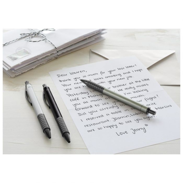 promjer kuglice: 1,0 mm (M); širina ispisa 0,5 mm; tijelo olovke izrađeno od aluminija; plastični vrh i klipsa; ergonomski grip; pritisni mehanizam daje sigurnost da tinta neće iscuriti u džepu; tinta ne blijedi (document proof); boja tinte: plava; refil standardni velikog kapaciteta; u poklon kutiji