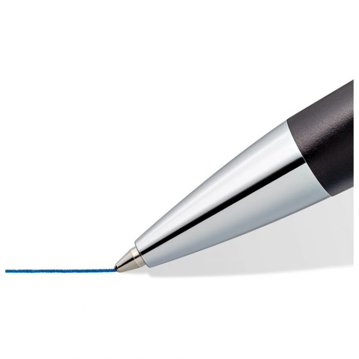 širina ispisa: M; metalna; uložak velikog kapaciteta (G2); sa ugraviranim natpisom STAEDTLER na prstenu i STAEDTLER Mars na kapici; boja tinte: plava; u kartonskoj poklon kutiji