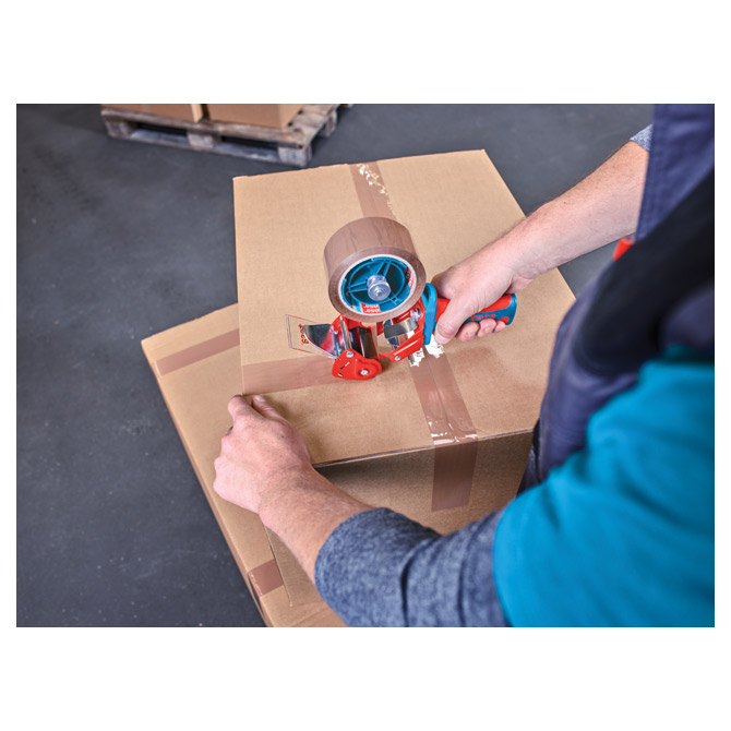 ručni; za trake do 50 mm x 66 m; gumirana grip ručka; zaštičen nož; reguliran pritisak; reže i ojačane trake