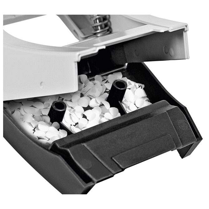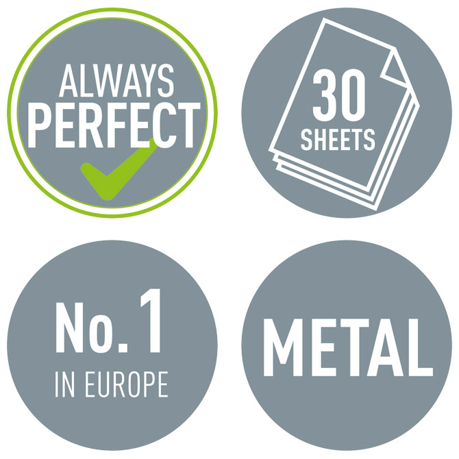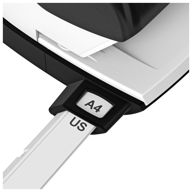 2 rupe; buši do 30 listova ili debljina 3 mm; razmak između rupa je 80 mm; sa spremnikom za otpadni papir u boji bušača; ima plastični graničnik za formate: A4, A5, A6,…; garancija 10 godina