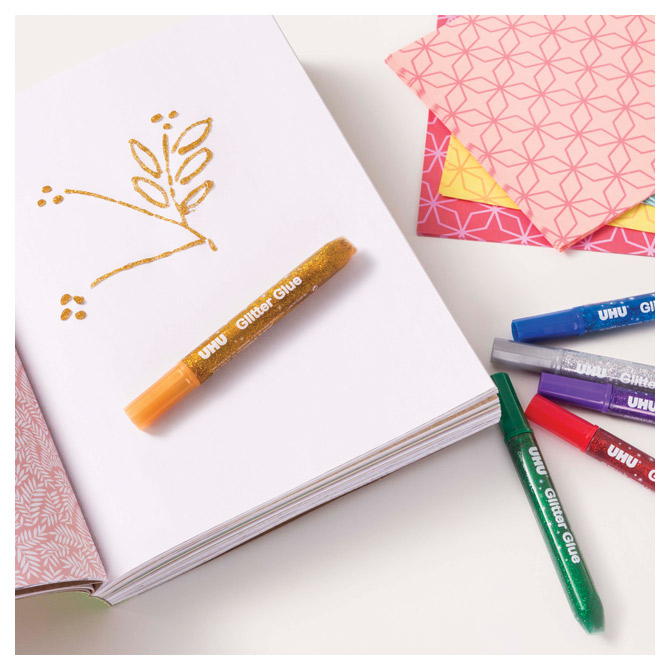 mekana tuba u obliku olovke za lakše dekoriranje; sa šljokicama (sjajni svjetlucavi efekti); za ukrašavanje papira, kartona, drvo i sl.; nije prikladno za: plastiku, neke vrste papira s premazom i metal; ne kaplje i ne rasteže se; ovisno o nanesenoj količini, ljepilo je suho na dodir nakon približno 30 minuta, a potpuno je suho nakon približno 12 sati; kada se osuši, ljepilo se može isprati na 30 °C u perlici ili ručno; dermatološki testirano; 20 g