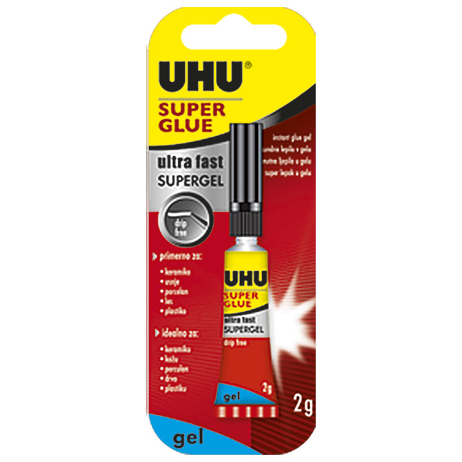 tuba; gel; za: drvo, keramiku, porculan, kožu i plastiku; nije pogodno za: polyethylene (PE), polypropylene (PP), stiropor, odjevne predmete od tekstila i kože; idealno za porozne materijale i lijepljenje na okomitim površinama, omogućuje naknadno pomicanje; veže trenutno velikom snagom lijepljenja; čisto i bez kapanja; 2 g; blister