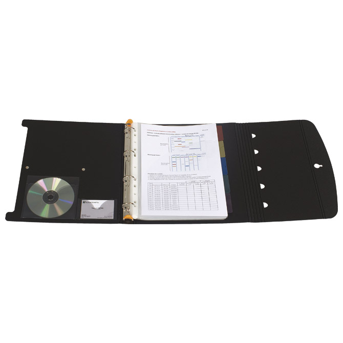 format: A4; dimenzija: 295×320 mm; reciklirani PP; 4 ringa; ring fi: 30 mm; sadrži: džep za vizitku i CD, 5 pregrada, 25 uložnih fascikli; može se složiti kao stolni stalak; zatvaranje na gumb