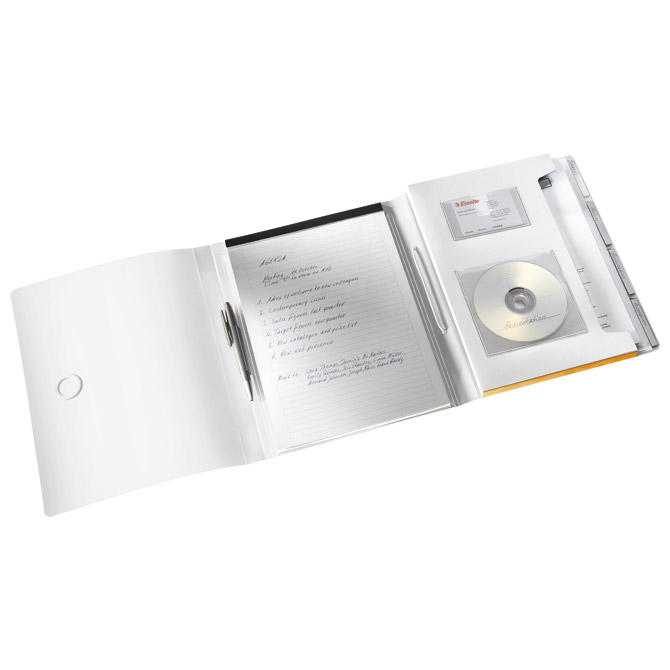format: A4; dimenzija: 240x320x26 mm; PP; sadrži: džep za vizitku, olovku i CD, blok za bilješke sa crtama ima 40 listova, dodatni odjeljak za odlaganje spisa sa 4 “L” fascikle; zatvara se sa gumicom; atraktivno metalno zatvaranje radi sigurnosti spisa