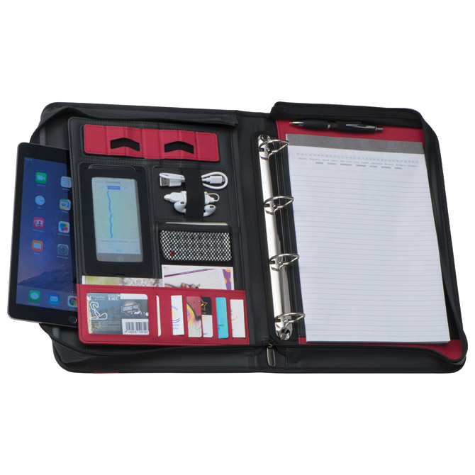 format: A4; dimenzija: 365x270x60 mm; sadrži: džepiće za kartice, pretince za mobitel, tablet i kalkulator, mjesto za olovku i kabele i blok za bilješke; 4 ringa; zatvaranje na zip; sa ručkom za nošenje