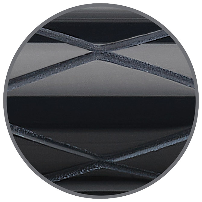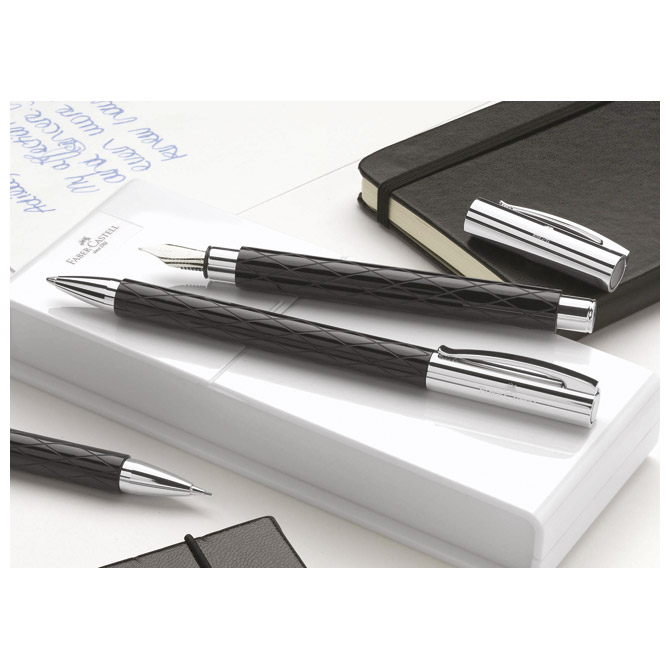 tijelo olovke izrađeno od crne dragocjene smole visokog sjaja sa utisnutim rombovima za moderan izgled; poklopac sa klipsom izrađen od kromiranog poliranog metala, a vrh od nehrđajućeg čelika; debljina pera F (fine); može se koristiti klasična patrona ili pumpica Faber Castell (pumpica uključena); u poklon kutiji