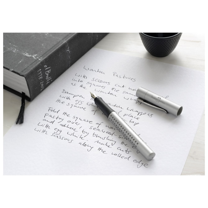 jedinstveni Grip dizajn; mekani grip za ugodnije pisanje; optimalna kombinacija tinte i vrha nalivpera omogućuje izuzetno glatko, nesmetano i lagano pisanje; metalna klipsa (srebrna) i vrh od nehrđajućeg čelika (srebrni); uravnotežena težina poklopca i kada je pričvršćena na stražnji kraj; pogodno i za ljevake; može se koristiti klasična patrona ili pumpica Faber Castell; u kartonskoj poklon kutiji