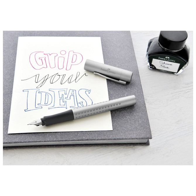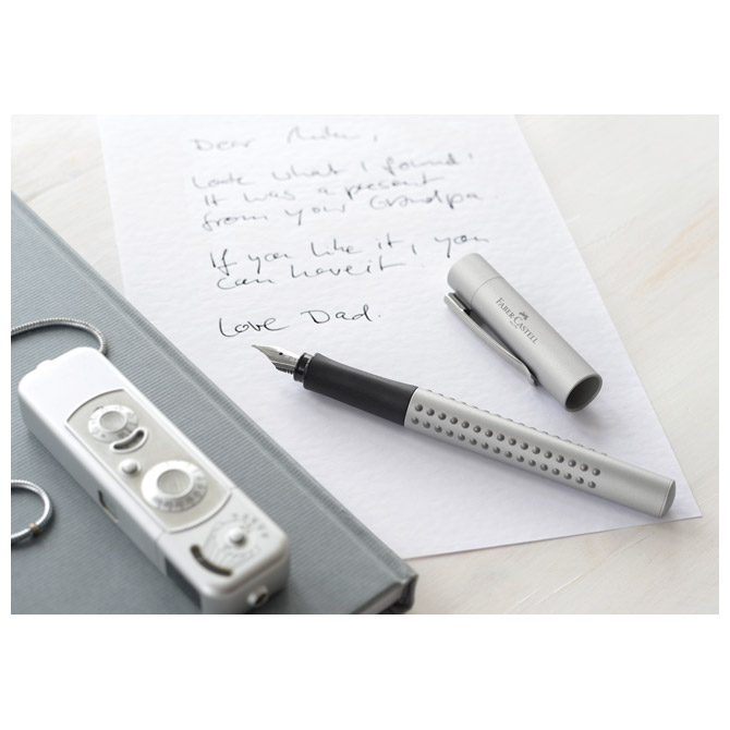 jedinstveni Grip dizajn; mekani grip za ugodnije pisanje; optimalna kombinacija tinte i vrha nalivpera omogućuje izuzetno glatko, nesmetano i lagano pisanje; metalna klipsa (srebrna) i vrh od nehrđajućeg čelika (srebrni); uravnotežena težina poklopca i kada je pričvršćena na stražnji kraj; pogodno i za ljevake; može se koristiti klasična patrona ili pumpica Faber Castell; u kartonskoj poklon kutiji