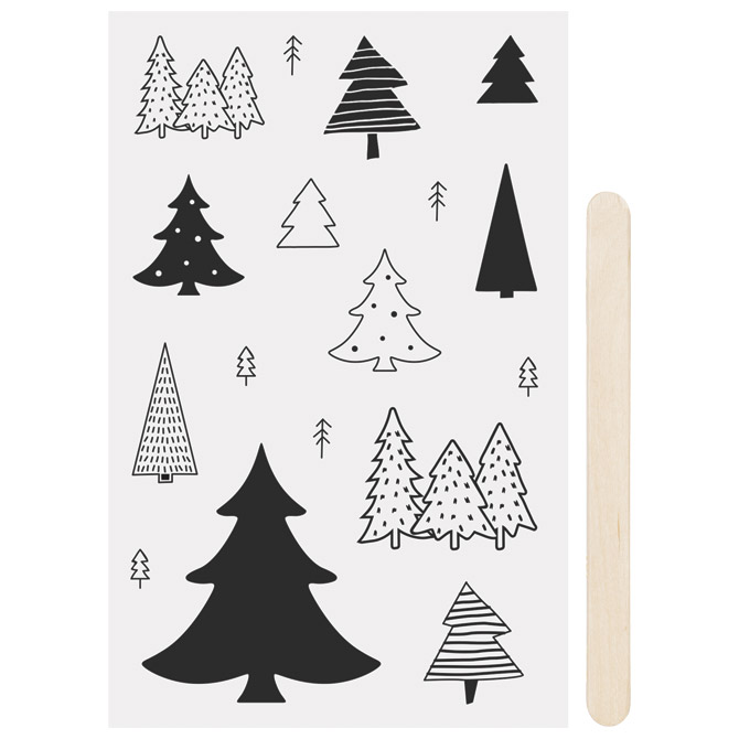 sadrži: 1 list sa motivima dimenzije: 10×19 cm i 1 drveni štapić; idealan za dekoriranje papira i kartona, također prenosiv na glatke površine poput stakla, porculana, drva i mnogih drugih u dekorativne svrhe; sa uputama (izrezati motive, odlijepiti podložnu foliju, staviti na odabrano mjesto i prenijeti trljanjem); nije perivo u perilici posuđa; blister