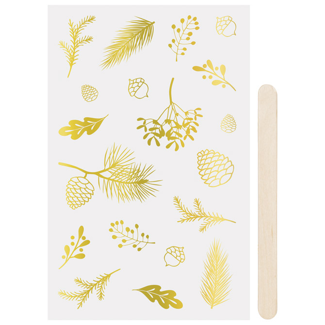 sadrži: 1 list sa motivima dimenzije: 10×19 cm i 1 drveni štapić; idealan za dekoriranje papira i kartona, također prenosiv na glatke površine poput stakla, porculana, drva i mnogih drugih u dekorativne svrhe; sa uputama (izrezati motive, odlijepiti podložnu foliju, staviti na odabrano mjesto i prenijeti trljanjem); nije perivo u perilici posuđa
