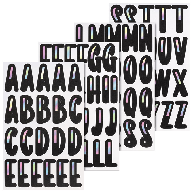 sadrži: 4 lista sa slovima; papirnate naljepnice s efektom sjaja i na djelu hologram; crna; blister