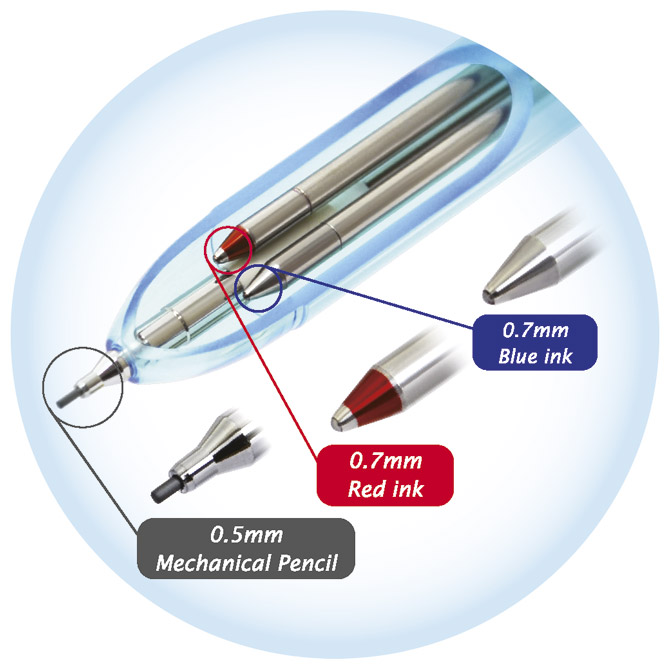 2 kemijske: 1 crvena i 1 plava tinta i tehnička olovka (mina 0,5 mm); 360° okretni mehanizam; rezervni uložak D1BR6707; u kartonskoj poklon kutiji